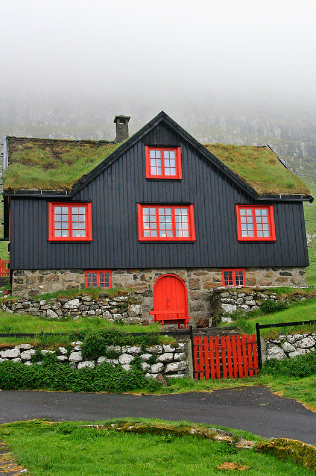 Aunque el pueblo de Kirkjubøur fue reconstruido luego de ser arrasado por tormentas hace dos siglos, lo que vemos hoy es el aspecto tradicional del lugar (y muy bien conservado). Los techos a dos aguas cubiertos de hierba son una respuesta a la disponibilidad del clima y de materiales desde hace siglos, un modo de construcción sustentable y tradicional que protege del frío, el viento y la humedad: